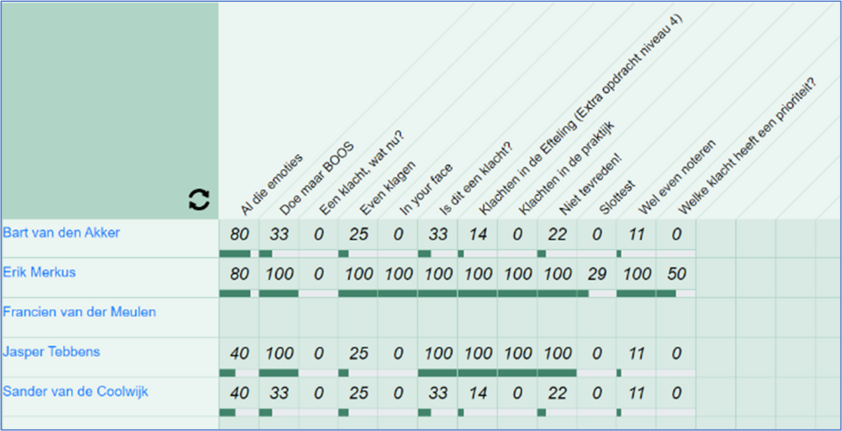 Naast het behoud van de designs van de leermiddelen, werken we ook aan de activiteitenmonitor. Met de activiteitenmonitor kun je als docent kan zien welke resultaten je studenten behalen zoals op quizzen, eindtoetsen etcetera. Ook met deze tool zitten we momenteel al in testfase. We zijn nu deze tool aan het doortesten bij de verschillende type gebruikers en we verwachten voor september een werkende tool te hebben.