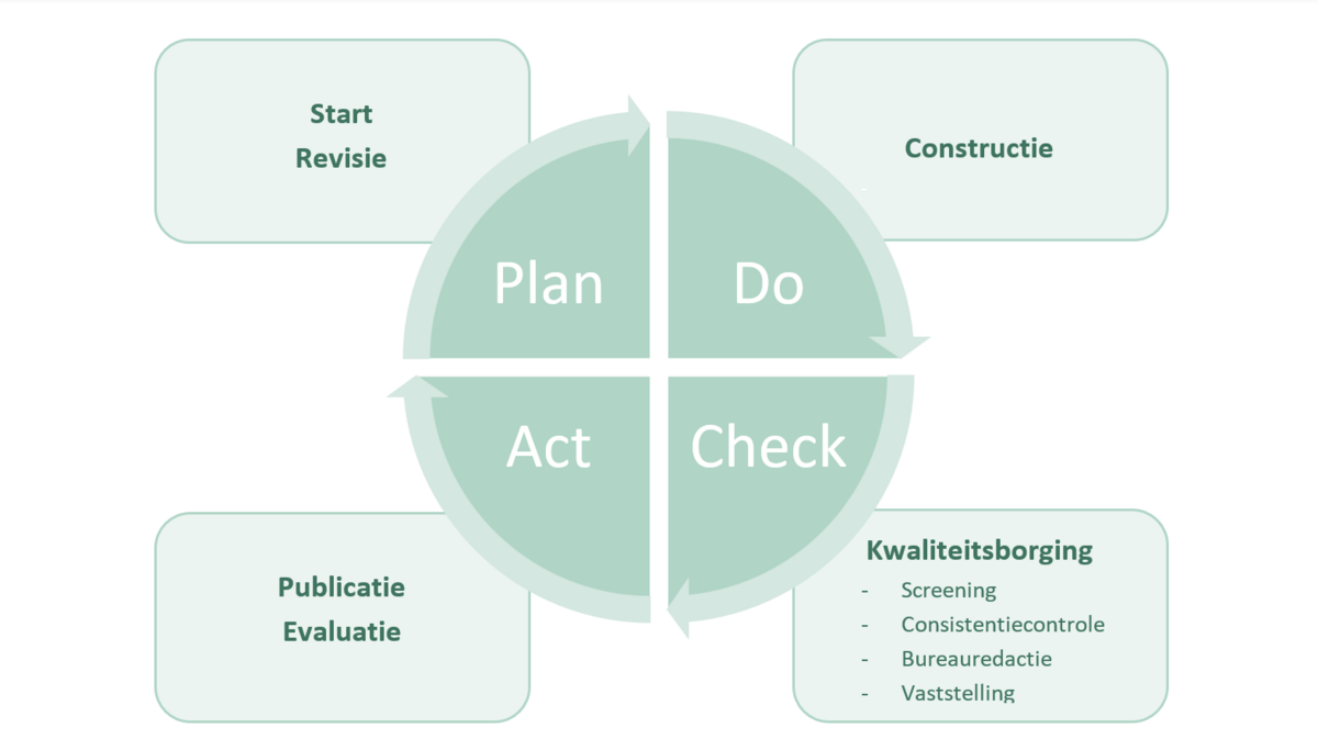 In de afbeelding zie je dat tijdens het productieproces alle fasen van de PDCA-cyclus worden doorlopen. De processtappen constructie, evaluatie en revisie lichten we hieronder verder toe.