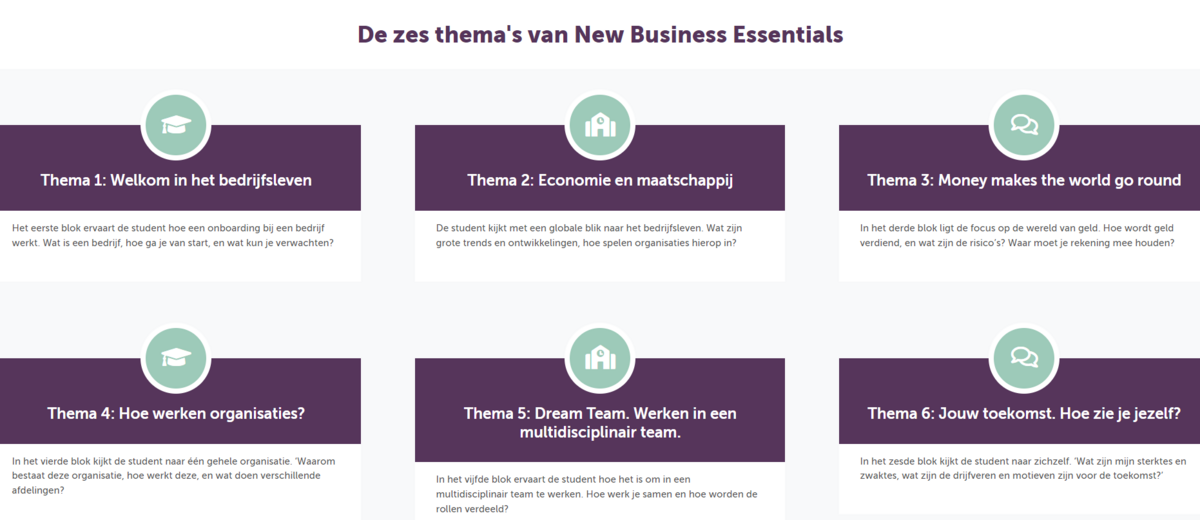 Het NBE programma is gestart voor de opleidingen van Business Services, maar geven ook studenten Commercie, Retail of Ondernemer studenten een vliegende start. Gedurende 6 maanden werken studenten één dagdeel per week aan één van de zes modules. In elke module staat één thema centraal:
