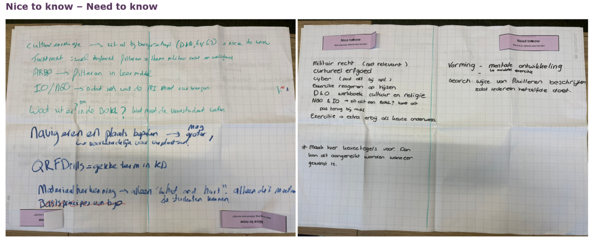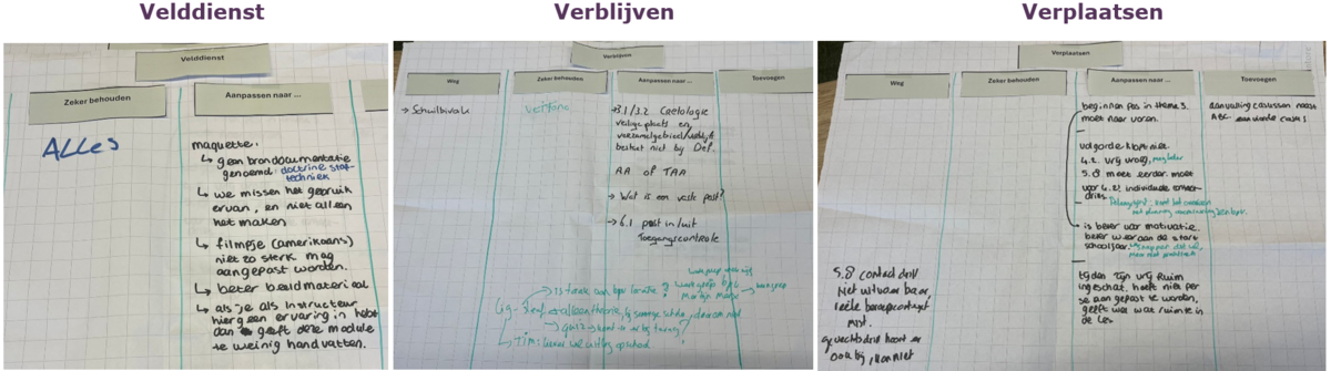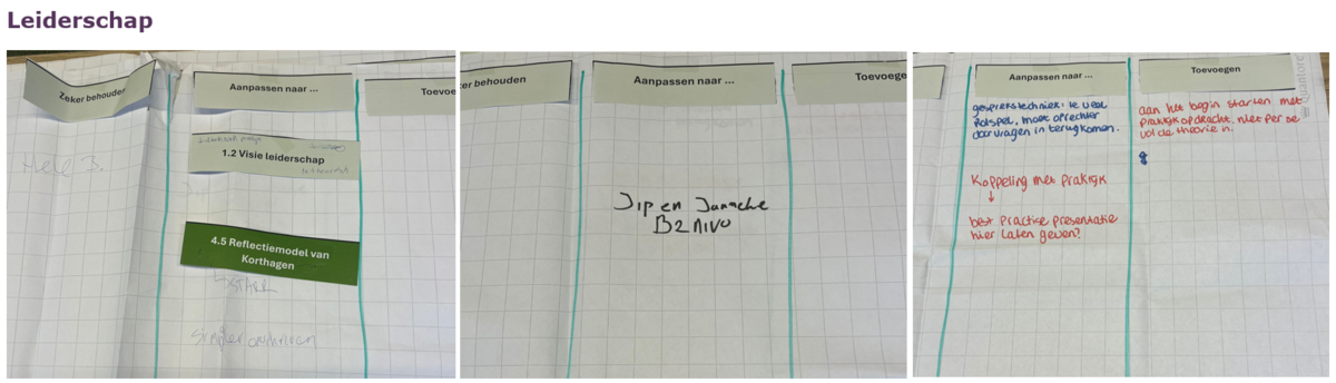 Na het welkom heten is er gekeken of er behoeftes zijn voor aanpassingen van de examens. Daarna zijn de deelnemers praktisch aan de slag gegaan met de verschillende onderwerpen die op het programma stonden. De modules Leiderschap zijn als eerste besproken, met als resultaat dat de meeste te spreken zijn over de module. De modules die aansluiten op EP 5/9 zijn daarna besproken en daarop is feedback geleverd. We hebben verder ook gekeken naar wat wij nu nice to know en need to know vinden voor de VeVa-student. Hieronder vind je de aantekeningen die we op de flipovers hebben gemaakt per onderdeel.